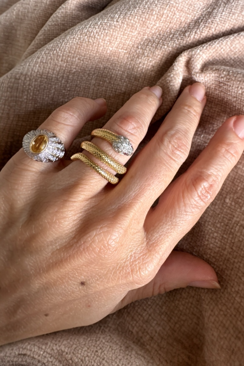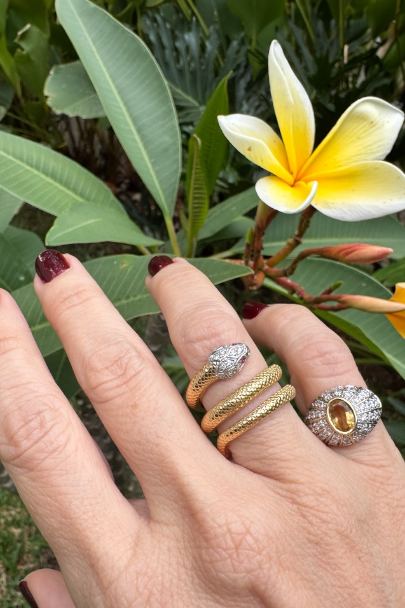 This exceptional 18 carat gold band is designed as a coiled snake made of yellow textured gold resembling the pattern of snakeskin. A bold, yet comfortable design, this snake ring slithers up the finger for a fiercely fashionable look that is so easy to wear.