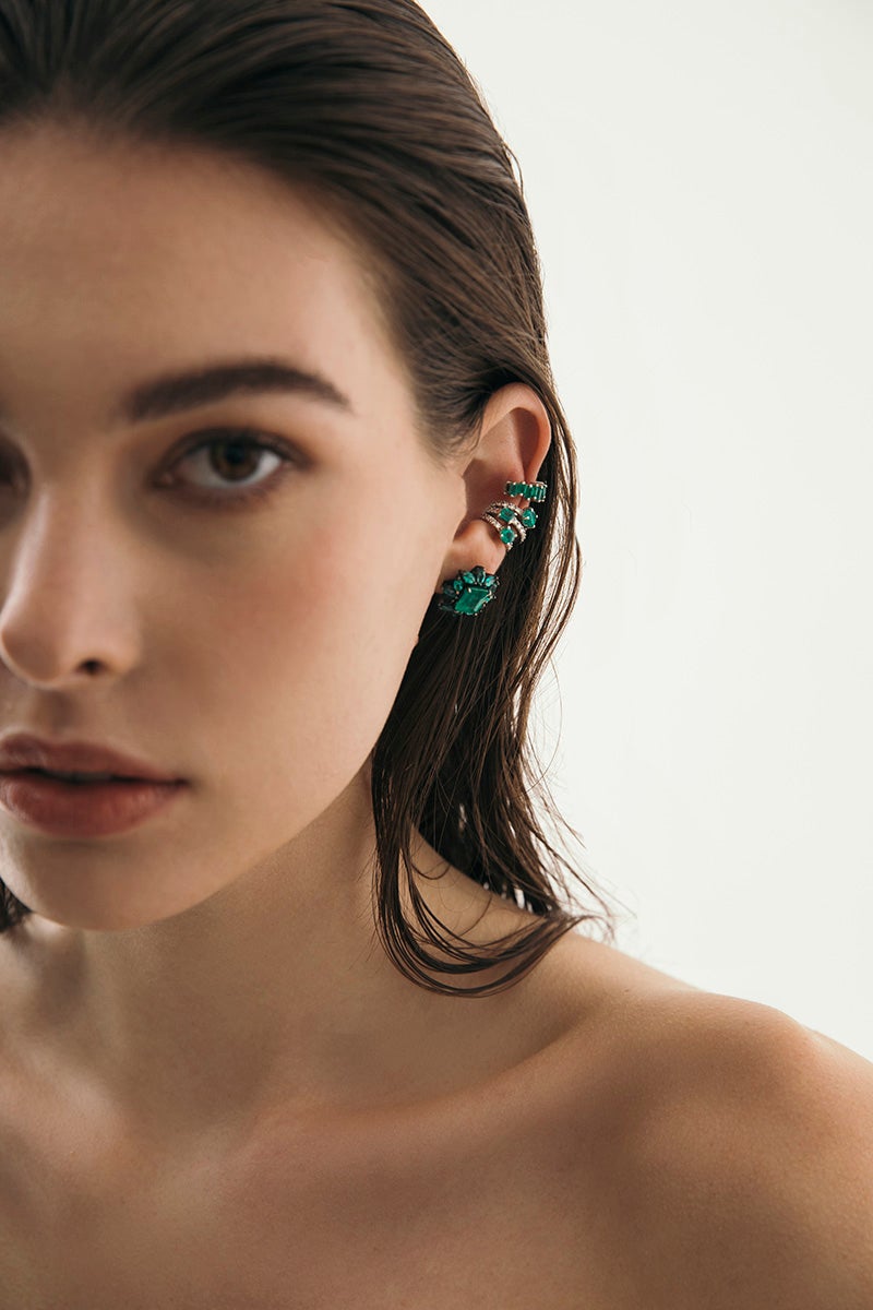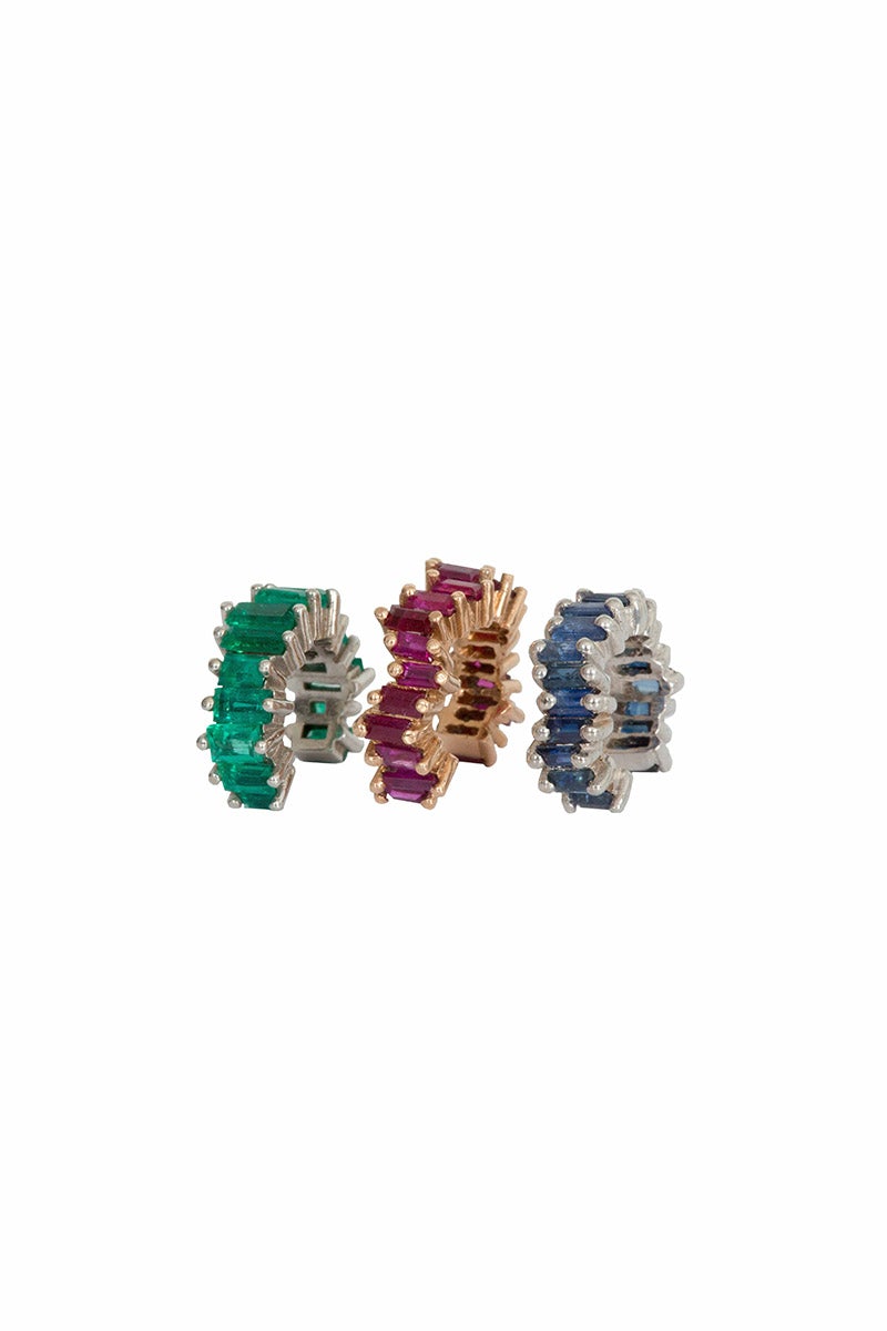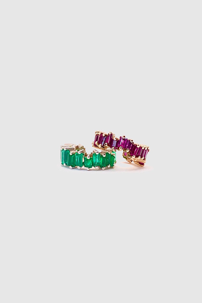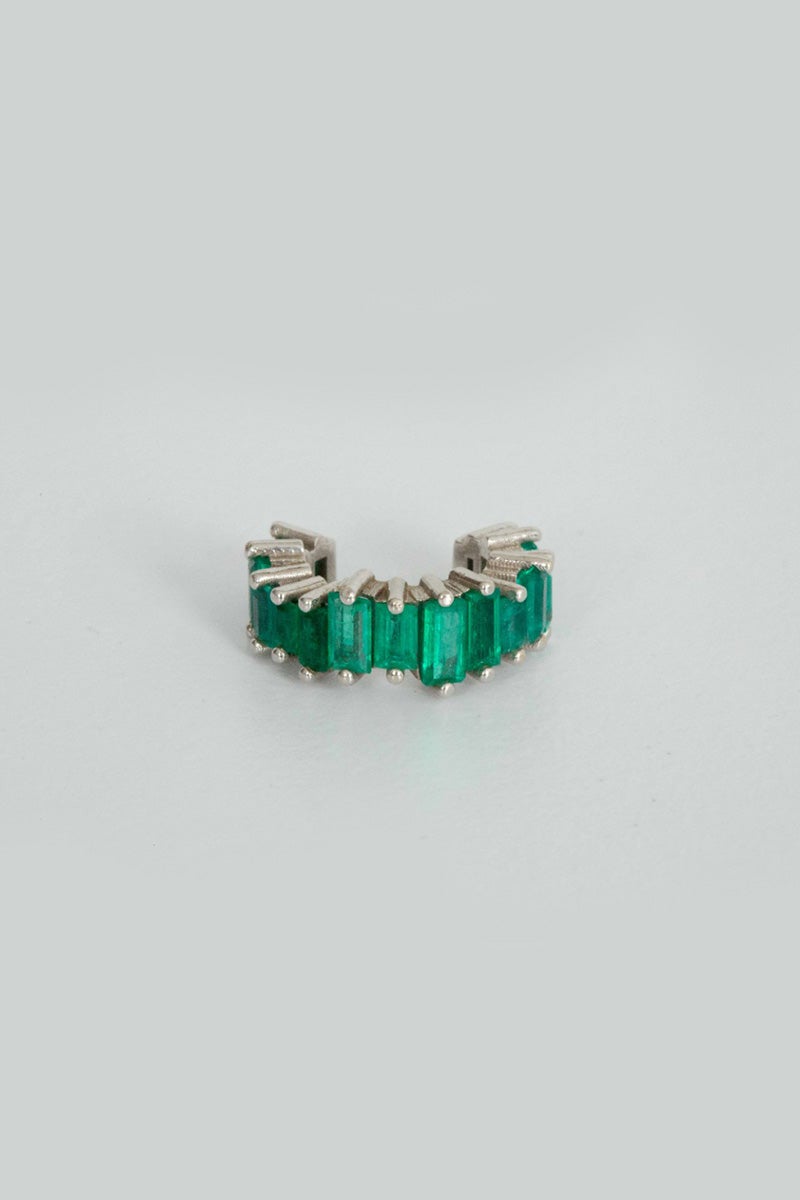 Emerald baguettes set unevelny in 18 carat white gold. No piercing needed with this slide through system.