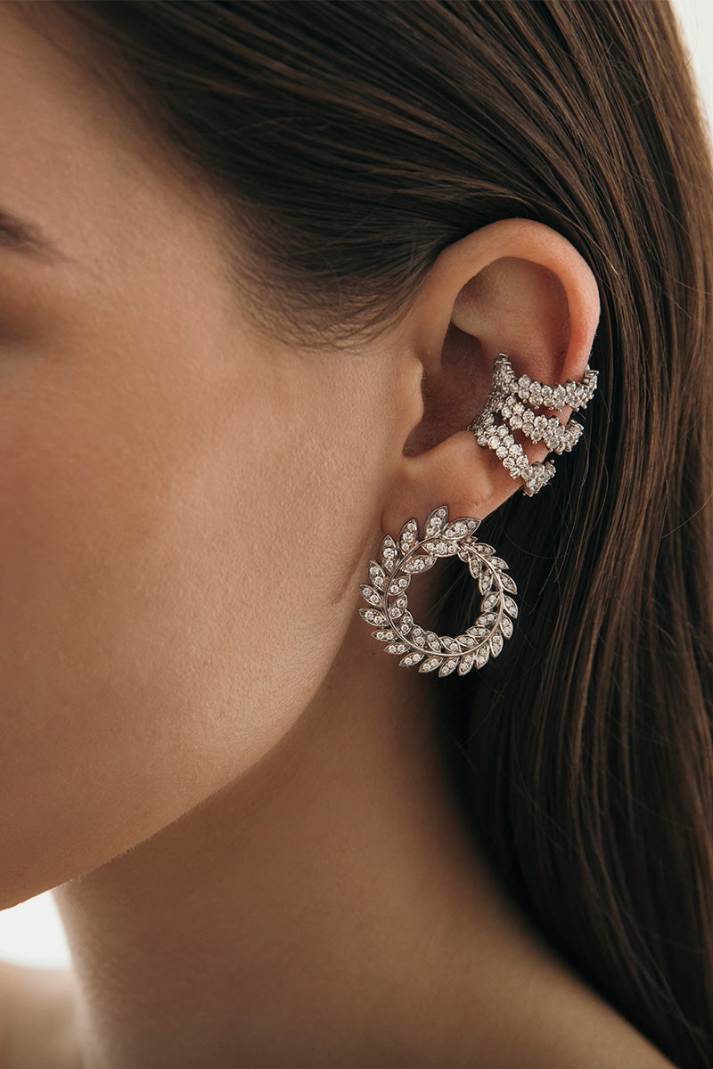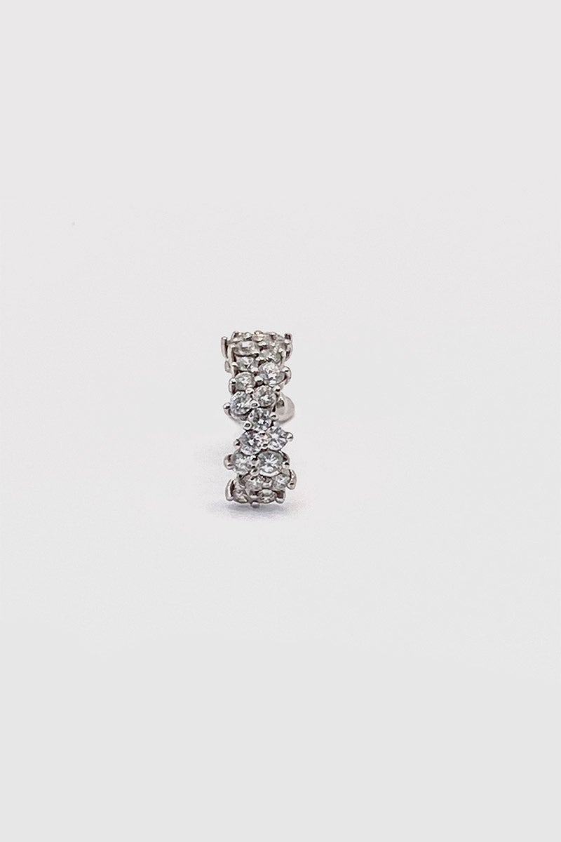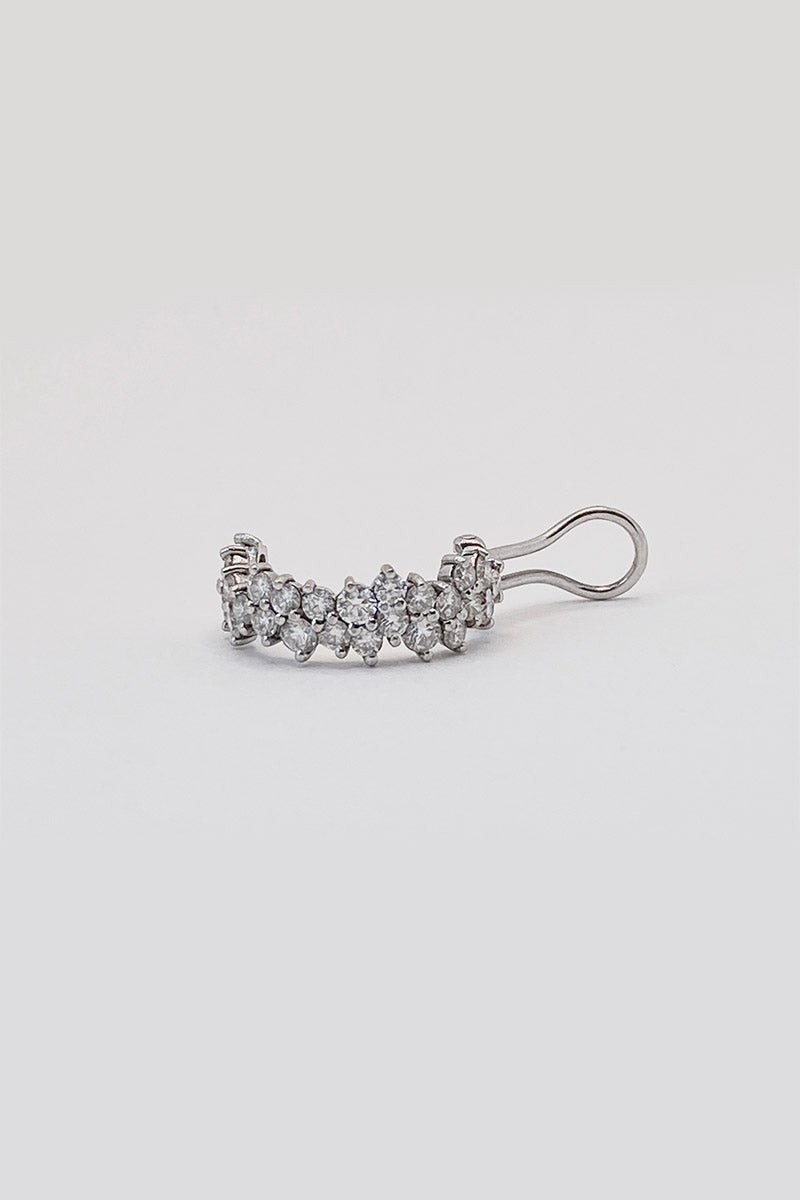 3 sizes of round diamonds come together harmoniously to create this show stopping cuff. Set in 18 carat white gold. No piercing needed, hinge for security.
