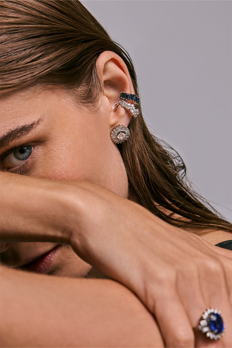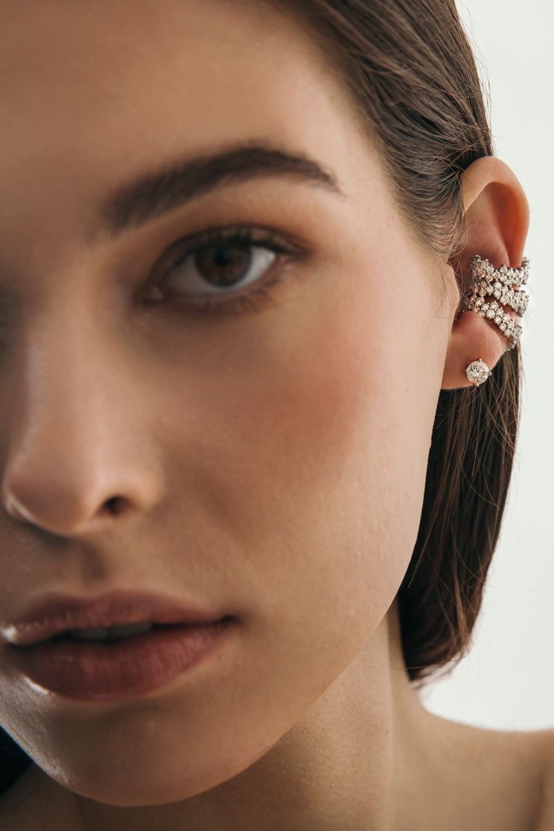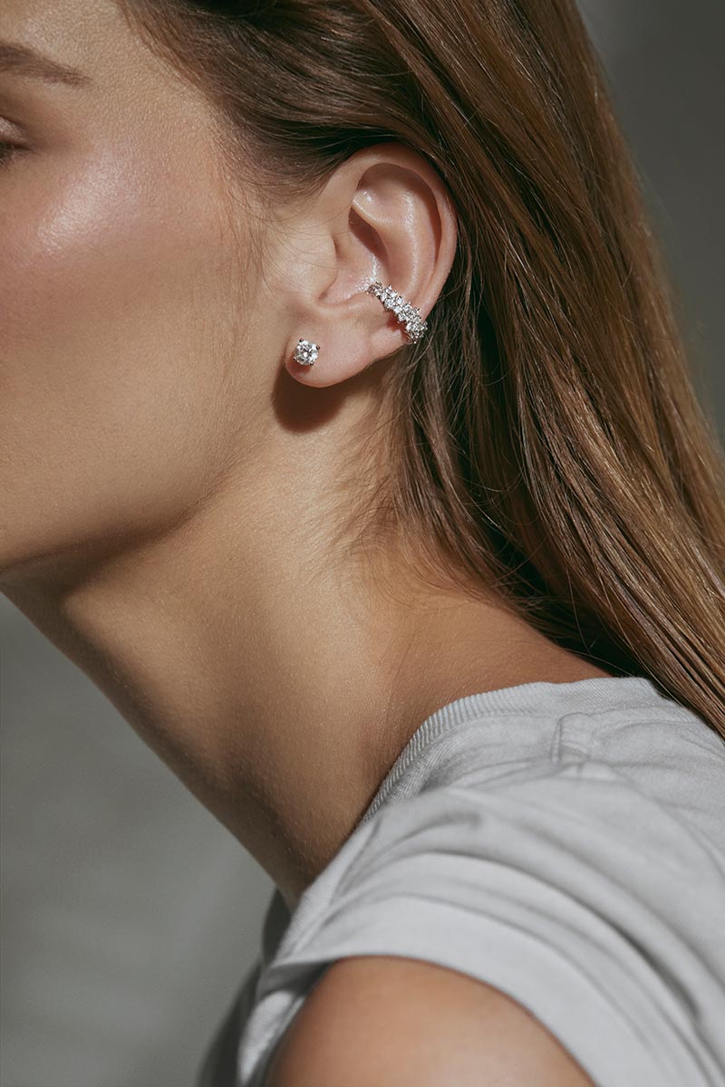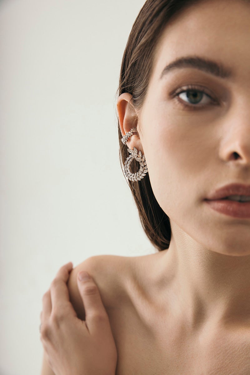 3 sizes of round diamonds come together harmoniously to create this show stopping cuff. Set in 18 carat white gold. No piercing needed, hinge for security.