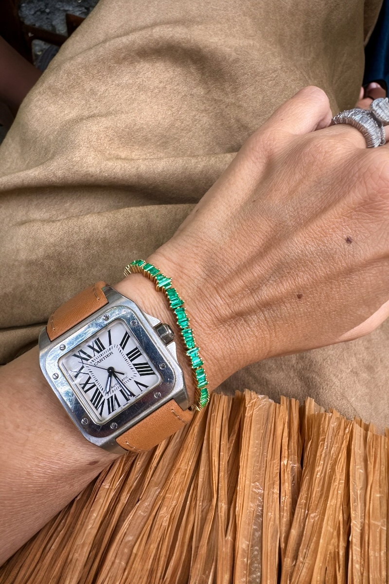 Our Crazy tennis bracelet is crafted in 18-carat gold and features a bold twist on tradition. Set with Colombian emerald baguettes, each stone is arranged in an unexpected pattern that defies symmetry, creating a vibrant rhythm of color and light. The unique setting highlights the natural beauty of the emeralds while giving the piece a modern, artistic edge.